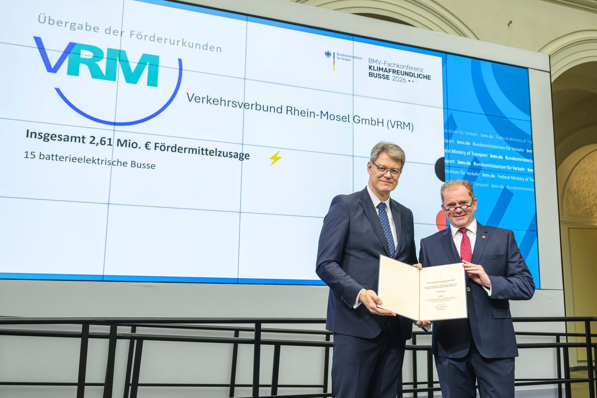VRM-Geschäftsführer Stephan Pauly empfängt Förderurkunde über 2,61 Mio. Euro für die Beschaffung von 15 E-Bussen von Bundesverkehrsminister Patrick Schnieder
